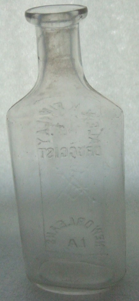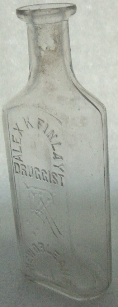 Embossed: ALEX K. FINLAY /DRUGGIST / (monogram AKF) / NEW ORLEANS, LA. (on front) A M F & CO / 54 (on base)