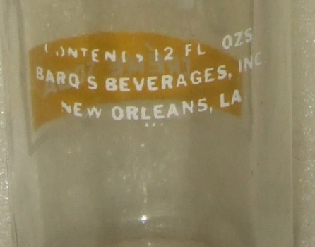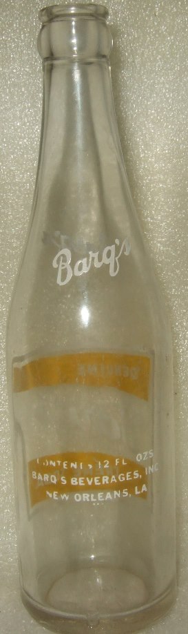 The front of the bottle reads as shown in the picture. The reverse: BARQ'S/ CONTENTS 12. FL. OZS. /BARQ'S BEVERAGES, INC./NEW ORLEANS, LA. The base is embossed: 0521/Duraglas/17 (symbol) 57/ 2. The condition is almost perfect with just the faintest of haze areas, but no damage. A couple of pin point specks are missing from the lettering, but no damage.