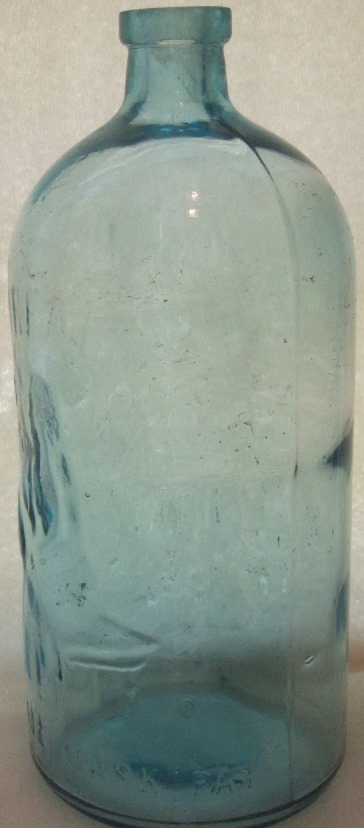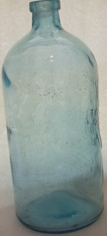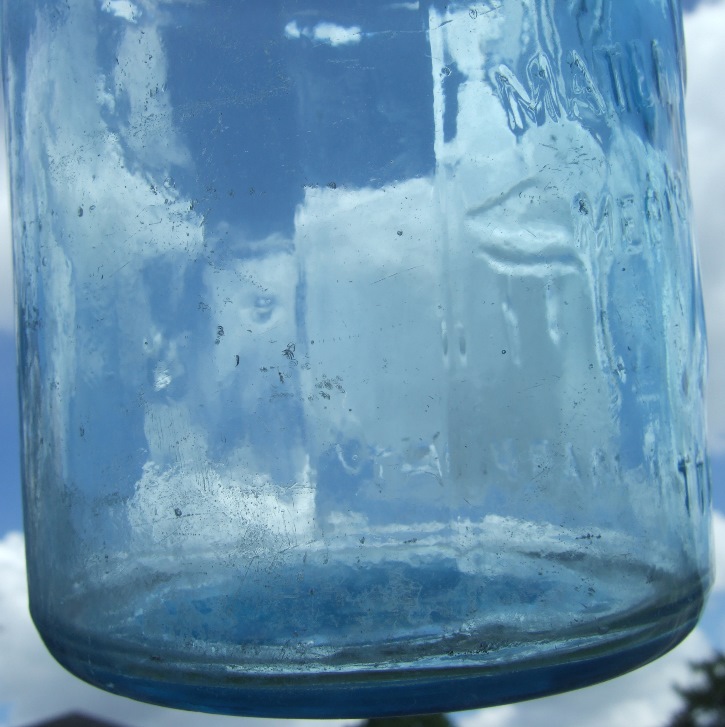 glass going around the blown bottle like rifling in a gun barrel. The bottle is not aqua, not Ball jar blue which