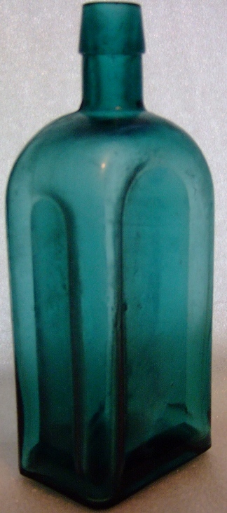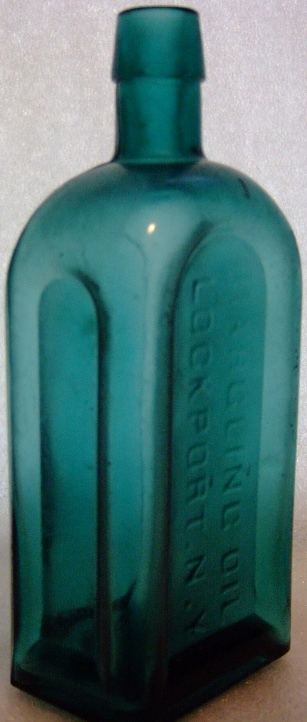 Embossed: GARGLING OIL / LOCKPORT, N. Y.. This pretty blue-green or Lockport Green bottle is 7 1/8" tall. It has an applied tapered collar lip. The condition is dug, but near mint with some light soil scratches and a couple of tiny peck marks, also minor haze and dullness. It wil respond well to a professional cleaning. No chips, cracks or deteriorated glass, only a small 1/4" scratch on the front shoulder