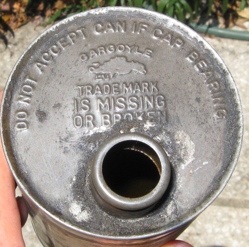 This can must date back to the 1920’s because the Vacuum Oil Company merged with Socony in 1931 and the company was known as Socony-Vacuum Oil Company. This can has VACUUM OIL COMPANY New York USA on both of its labels. The can has paper labels with a cool graphic of a gargoyle on both of them. The top of the can also has a gargoyle embossed on it as shown in the picture. The can has some discoloration on the label due to a couple of light areas of rust. There is also some chipping on the label and some minor pitting on the bottom of the can.