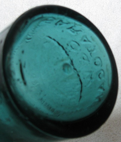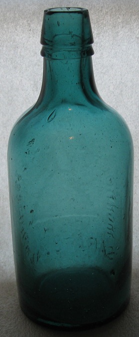 The bottle is 7 3/4" tall with a tapered collar and skirt lip that has a 3/16" shallow chip in the skirt and a light chipping along the lip along with a corresponding bruise on the inside measuring 1/2" long.