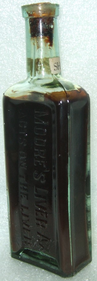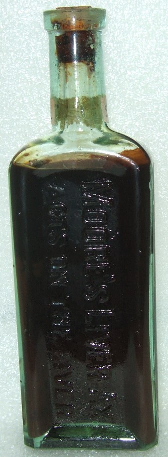 Embossed: MOORE'S LIVER-AX / ACTS ON THE LIVER. This medicine is about 7 1/16" tall, 2 1/4" wide, 1 1/4" thick, aqua glass, tooled lip and strongly embossed. It is in mint condition with contents and labels. The neck label reads SHAKE WELL, and the body label, in part, reads "It Touches The Spot / Moore's / Liver - Ax / Alcohol Not Exceeding 20% / Better Than Calomel / Does Not Gripe Or Make You Sick / Is Purely Vegetable / Manufactured And Guaranteed By / Moore Liver - Ax Co. / Nashville, Tenn. / Serial Number 53010