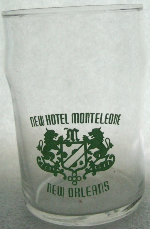 This glass is clear with medium yellow green applied color label that reads NEW HOTEL MONTELEONE / Emblem with 2 rampart lions on each side of a sheild / NEW ORLEANS. The glass is 3 7/8" tall and is in mint condition.