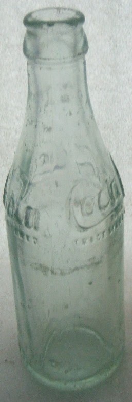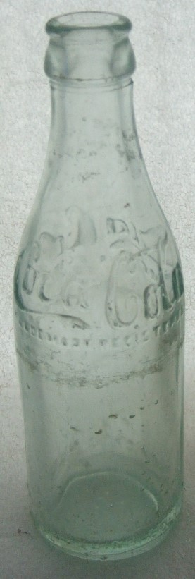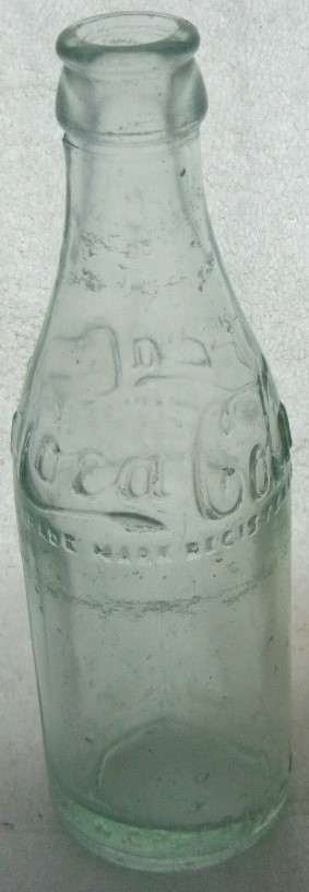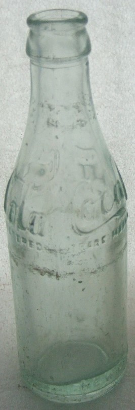 This is an early 1910-1915 ABM Script shoulder and base embossed. It is aqua, 7 1/2" tall with no real damage except for some horizontal case lines and a few tiny pinsize moon dings and some very light water stain. The body is embossed Coca Cola (in script) / TRADEMARK REGISTERED on both sides of the shoulder and near the base is embossed PROPERTY OF COCA COLA / BOTTLING CO./NEW ORLEANS, LA. The bottom has Coca Cola in script embossed on it.