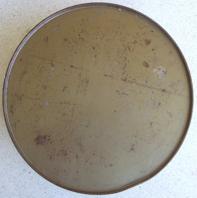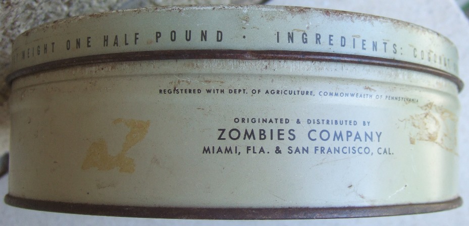 This tin is 6 11/16" diameter by 2" tall. It shows a multi color picture of a Haitian or Jamacian village scene. There is a minor dent on the bottom edge and a little surface rust on the top right edge. Made by the Zombies Co., Miami, Fla & San Francisco, CA.